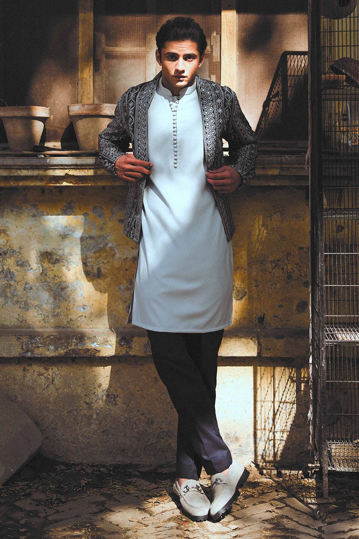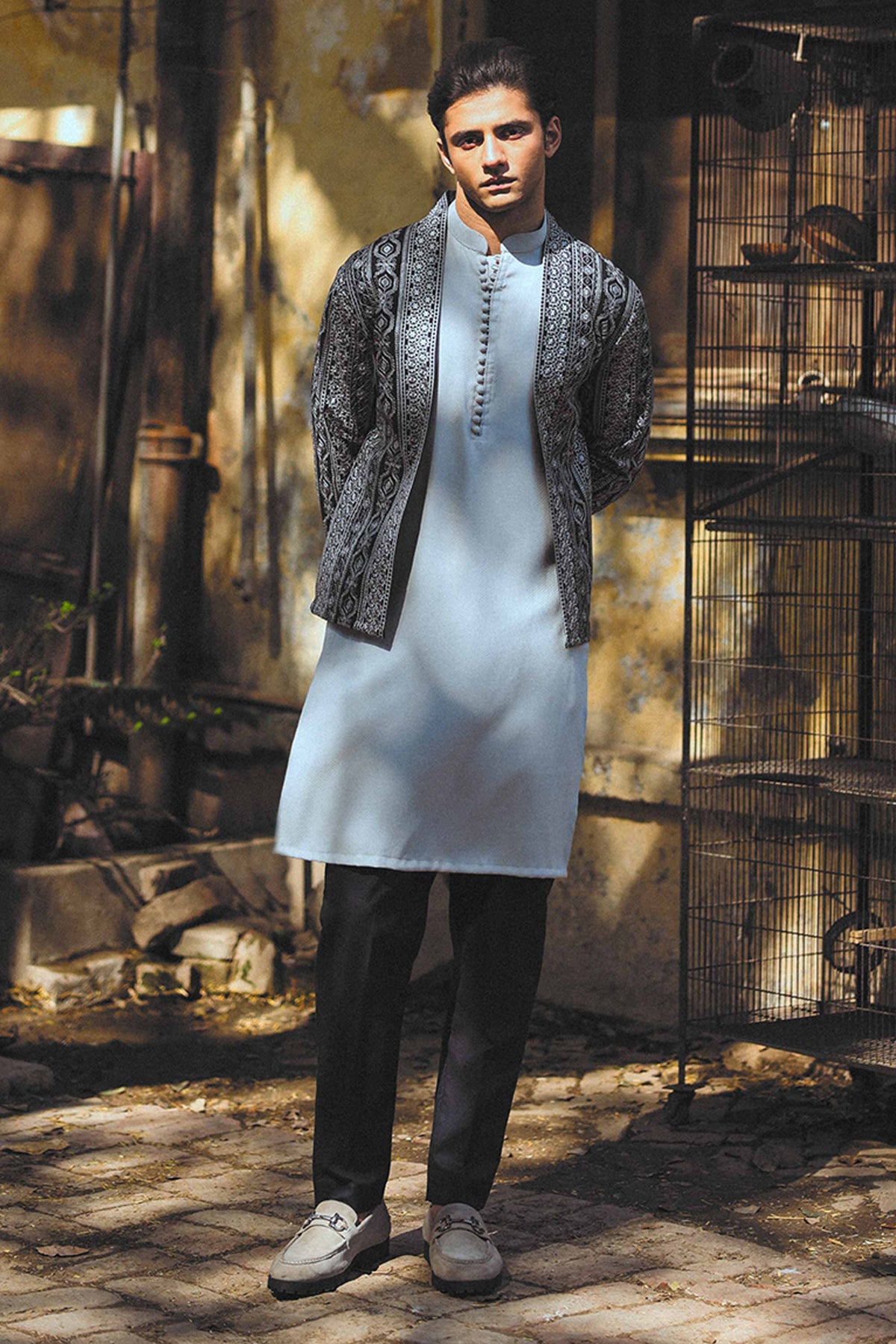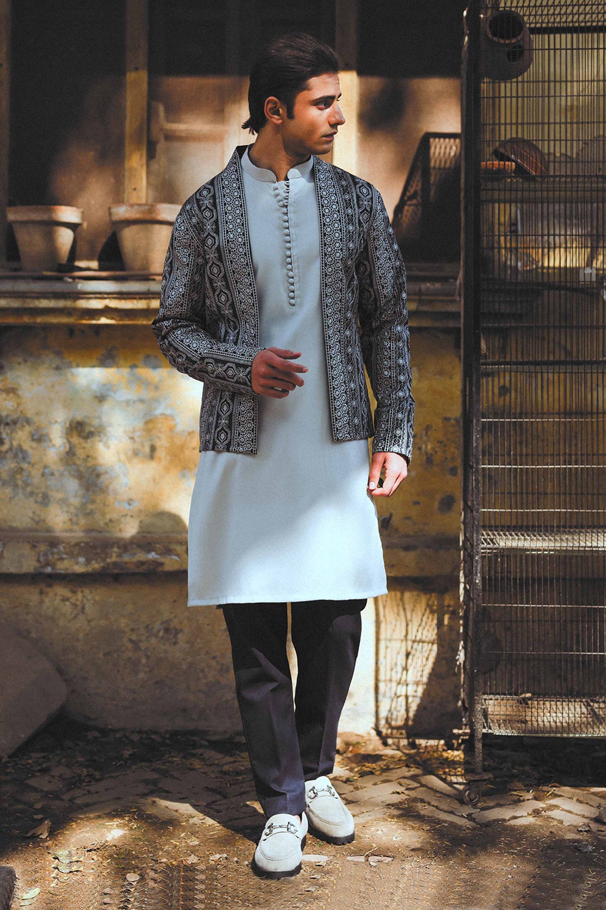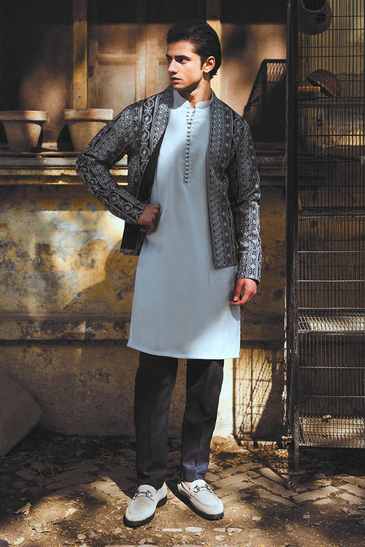 Discover timeless sophistication with our Navy-Blue Embroidered Cardigan with Light Grey Kurta Trousers Set. This stunning ensemble combines the regal elegance of navy blue with the fresh light grey tones, making it the perfect choice for both formal events and semi-formal gatherings. Adorned with exquisite embroidery, this set exudes modern charm while honouring traditional design elements. The cardigan is made from premium navy-blue fabric, creating a luxurious, deep hue that complements the overall design. Its embroidered pattern adds a touch of artistry and elevate the look. Delicate embroidery on the cardigan showcases intricate geometric pattern, carefully crafted to add a rich, textured detail, enhancing the sophistication of the entire set. The light grey kurta beneath the cardigan offers a soft, serene contrast to the bold navy-blue cardigan, creating a balanced and refined look. The clean and timeless kurta design adds an effortless charm to the ensemble. Paired with matching navy-blue base trousers, this set offers a sleek, modern silhouette. The trousers are designed to provide both comfort and a sleek fit, completing the look with style.